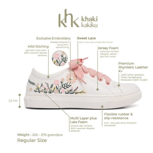 Embroidery sneakers yang dirancang dengan motif bunga daisy sehingga memiliki look yang feminine tetapi tetap sederhana. Amira Emboidery sangat cocok digunakan untuk daily activities.