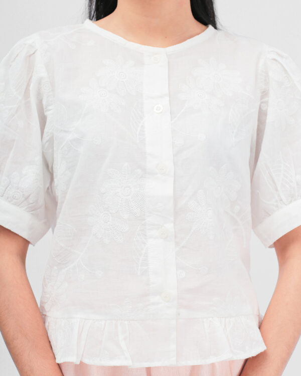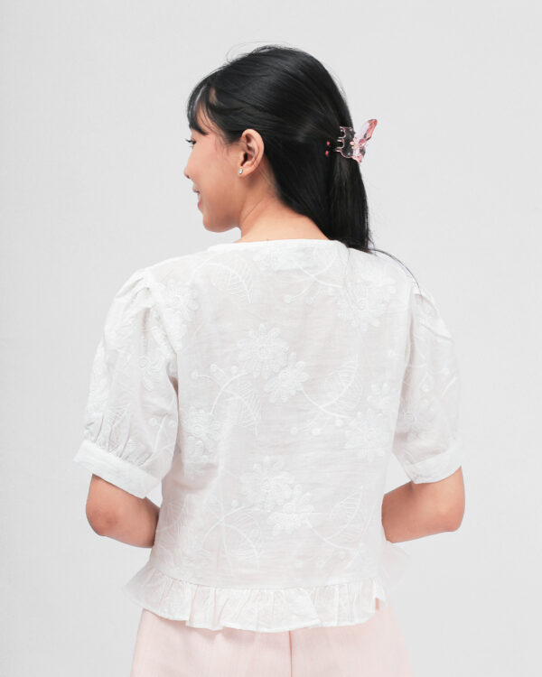 Embroidery top yang dirancang menggunakan material yang lembut dan tipis membuat Delya top nyaman digunakan untuk sehari-hari. Delya top memiliki detail embroidery dengan motif bunga dan ruffles.