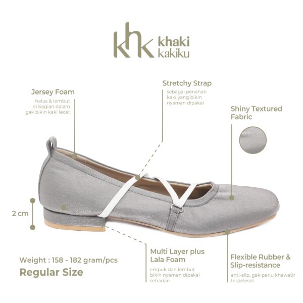 Faelly Flatshoes dirancang dengan look simple, feminim, dan elegant. Dengan material upper shiny textured fabric membuat tampilan shiny ketika terkena sinar matahari. Juga dilengkapi dengan stretchy strap yang membuat nyaman dipakai