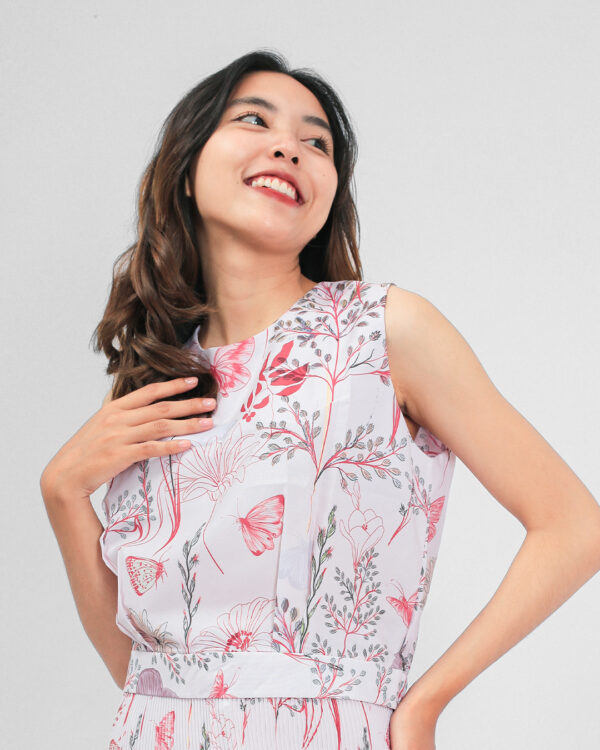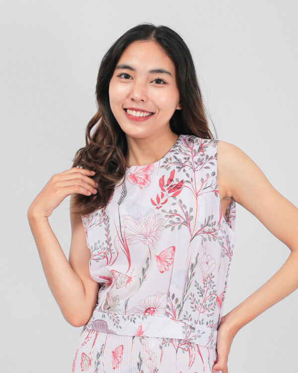 Sleeveless top dengan potongan sederhana dan memiliki detail ban pada pinggang. Fairy top dirancang dengan material bermotif kupu kupu yang nyaman dan lembut .