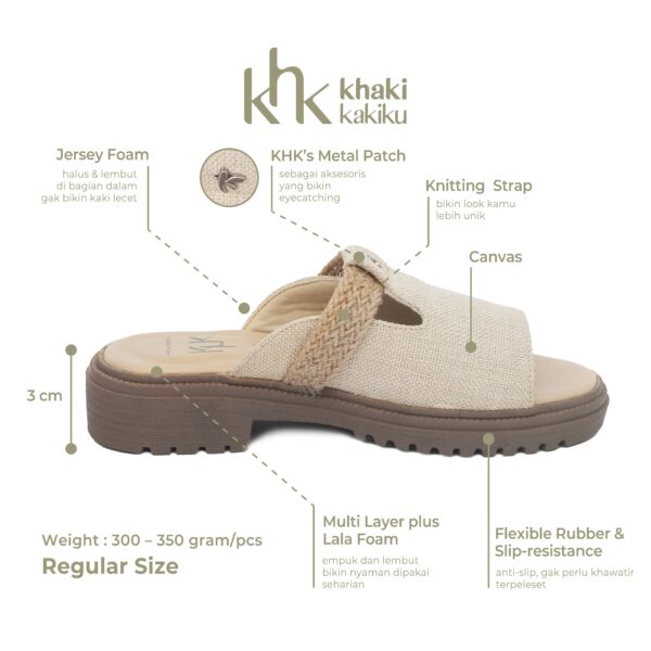 kaylin sandals dirancang dengan tampilan simpel dan unik karena memiliki 2 kombinasi material dari bahan kanvas dan tali rajut sebgaai aksesoris, selain itu warna material kanvas di bagian samping depan membuat penampilan lebih unik dan stylish.